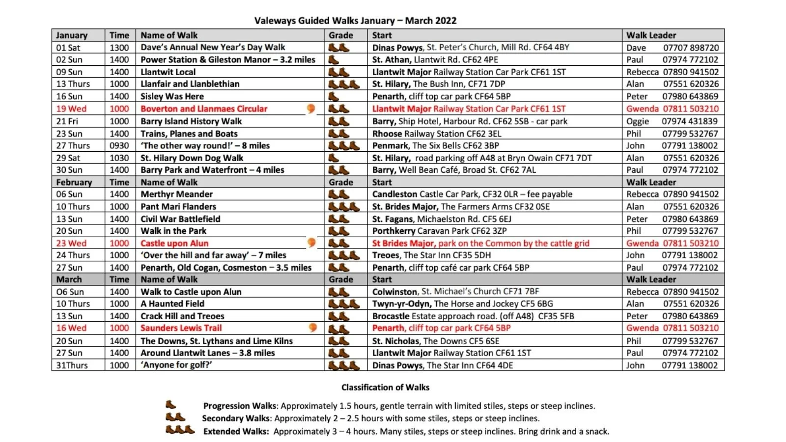 To help you choose a walk suitable for your abilities or interest Valeways offers a quarterly walking programme with walks on several days of the week and throughout the Vale of Glamorgan. Each of these is graded to indicate the level of difficulty and the expected walking time.